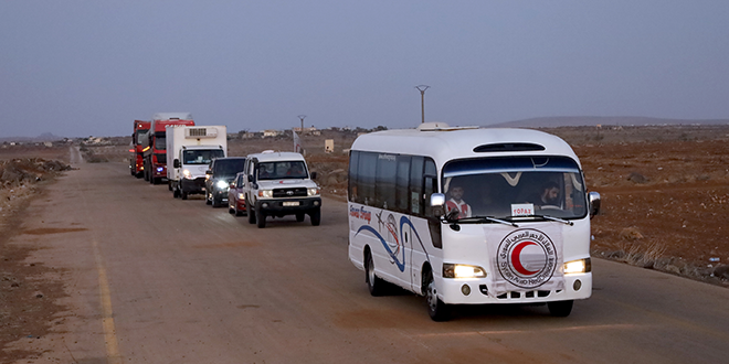 وصلت إلى مدينة بصرى الشام في ريف درعا الشرقي اليوم قافلتان تقل الأولى 200 مدني والثانية 80 شخصاً من رعايا 3 دول تم إجلاؤهم من محافظة السويداء.