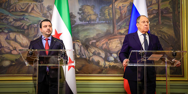 أكد وزير الخارجية والمغتربين أسعد حسن الشيباني ونظيره الروسي سيرغي لافروف عمق العلاقات التاريخية بين سوريا وروسيا، وشددا على ضرورة تعزيز التعاون القائم على الاحترام المتبادل، مجددين دعمهما لتعزيز الشراكة الثنائية بما يخدم مصالح الشعبين ورفض أي تدخلات خارجية.