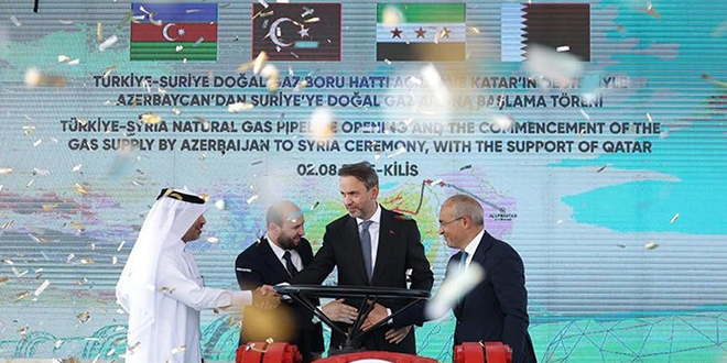 وكانت بدأت أمس عملية توريد الغاز الطبيعي من أذربيجان إلى سوريا عبر الأراضي التركية، بحضور وزير الطاقة السوري المهندس محمد البشير، ووزير الطاقة التركي ألب أرسلان بيرقدار، ووزير الاقتصاد الأذربيجاني ميكائيل جباروف، وممثلين عن صندوق قطر للتنمية، وذلك بمعدل نحو 3.4 ملايين متر مكعب من الغاز يومياً في المرحلة الأولى.