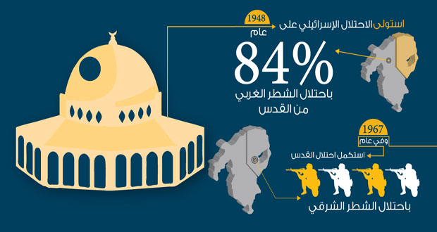 وفي الخامس من حزيران عام 1967 أشعل الاحتلال الاسرائيلي حرب حزيران العدوانية واحتل الجزء الشرقي من مدينة القدس وأصدر قرارا ضم فيه الضفة الغريبة بما فيها القدس وبدأ بتغيير معالم المدينة المقدسة وتدمير أحيائها وبناء مستعمرات تحيط بها من جميع الجهات وتحويل سكانها العرب إلى أقلية.