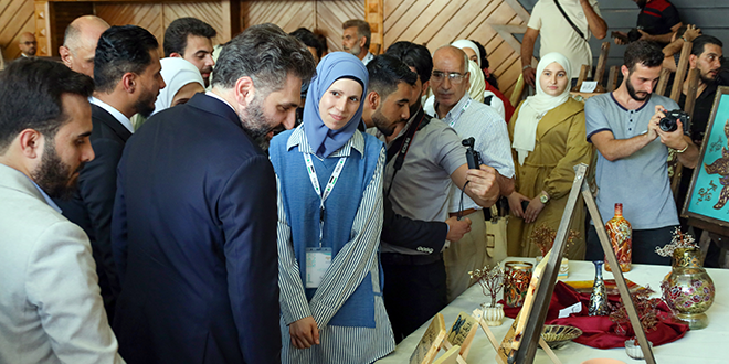 وبدأت الفعالية بافتتاح الوزير الصالح معرضاً منوعاً في بهو مسرح دار الثقافة، ضم لوحات تشكيلية، وفن الخط العربي، والتصميم والتنفيذ، والتصوير الضوئي، والأرابيسك، إضافة إلى قسم التراث الذي ضم أواني الفخار، وفن العجمي، والنقش على الزجاج، والأشغال اليدوية التي تعكس مهارة الحرفيين وعمق الموروث المحلي.