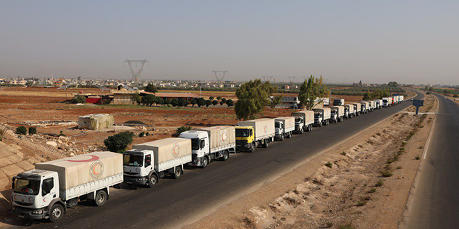 لحظة دخول قافلة المساعدات الإغاثية إلى محافظة السويداء عبر ممر بصرى الشام الإنساني