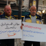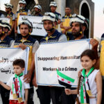 وفي حلب رفع المشاركون في الوقفة التي أقيمت في قلعة حلب لافتات تندد بالاختطاف وتطالب بضمان سلامة العمارين مع التأكيد على رفض جميع أشكال الاعتداء على العاملين في المجال الإنساني الذين يؤدون واجباً إنسانياً بحتاً في ظروف بالغة الصعوبة.