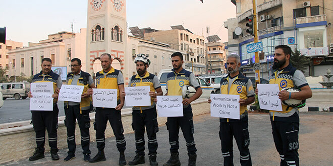 نظم الدفاع المدني السوري اليوم، وقفات تضامنية في عدد من المحافظات، للمطالبة بالإفراج الفوري عن المتطوع حمزة العمارين الذي اختطفته مجموعات مسلحة في مدينة السويداء في 16 تموز الماضي أثناء مهمة إنسانية، وللتأكيد على ضمان سلامته ورفض جميع أشكال الاعتداء على العمال الإنسانيين.