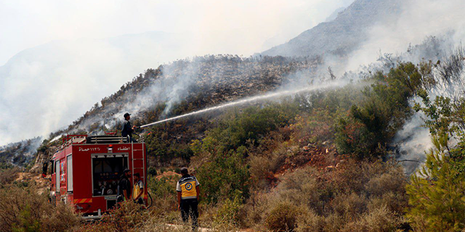تستمر فرق الإطفاء في الدفاع المدني السوري وأفواج الإطفاء، وأفواج الإطفاء الحراجي، بمساندة الأهالي، والطائرات المروحية التابعة لوزارة الدفاع، بالعمل على مواجهة حرائق الغابات في ريفي اللاذقية وحماة.