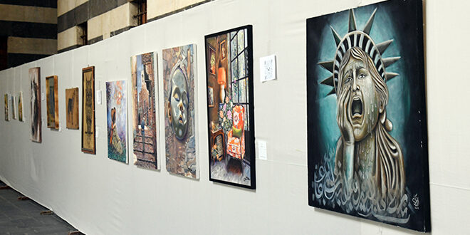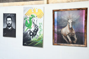 وضم المهرجان الذي ينظمه منتدى خيزران الثقافي برعاية وزارة الثقافة على مدى يومين، معرضاً للفن التشكيلي شمل 70 لوحة رسمها 18 فناناً على مدى سنوات الثورة في خضم الحصار والقصف الجوي والمعارك، في طليعتهم الراحل عبد القادر عبد اللي، فجسدت أعمالهم كفاح الشعب في سبيل الحرية، ورفضه للظلم وللاستبداد، وأعلام الثورة الراحلين، وتناولت الأخرى معالم سوريا وجمالها وحتمية انتصارها على الطغيان بأسلوب واقعي ورمزي وتعبيري.