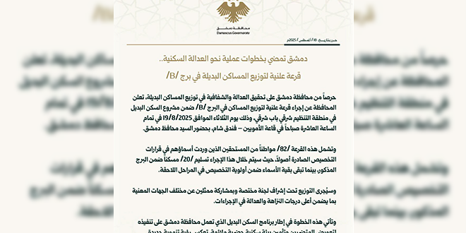 أعلنت محافظة دمشق عن إجراء قرعة علنية لتوزيع المساكن في البرج /B/ ضمن مشروع السكن البديل بمنطقة التنظيم شرقي باب شرقي، بحضور محافظ دمشق ماهر مروان إدلبي.