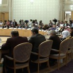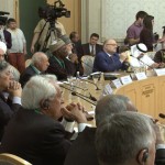بدوره اعرب سماحة الدكتور أحمد بدر الدين حسون المفتي العام للجمهورية في كلمته عن سروره بهذا اللقاء على أرض روسيا الدولة التي تجمع العالم الإنساني بكل أطيافه ولغاته ويعيش الجميع على أرضها بسلام ووئام لكونها لم تتحالف مع أحد لتقصف بلادا أو تقتل بشرا بل جمعت أبناء الدول من حكام ومعارضين لتقيم الصلح بينهم كما أن روسيا تامل منا جميعا مسلمين ومسيحيين اليوم بأن نبني شيئا للسلام أمام ما يحدث اليوم ونحن جالسون هنا ففي فلسطين أطفال وأناس يذبحون من قبل عدو قال أحد وزرائه الصهاينة بالأمس “إنه ليس هناك أمتع من أن نقتل عدونا ولكن الأكثر متعة أن يقتل عدونا عدونا”.