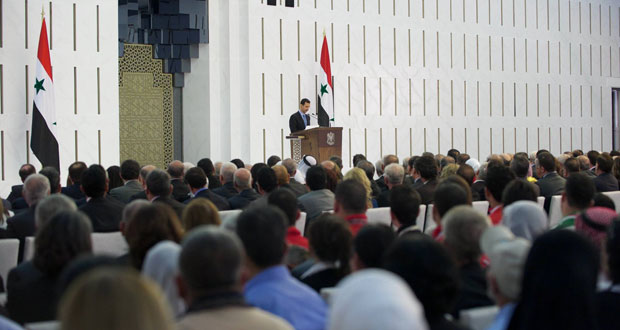 واشار الى أن خطاب الرئيس الاسد واداء القسم تعبير واضح عن إرادة الشعب العربي في مواجهة العملاء والصهيونية والرجعية الذين يدبرون المكائد ويسعون لهدم إرادة الشعب العربي موءكدا ان السوريين تجاوزوا الموءامرة الراهنة بصمود ثلاث سنوات وكشف أبعادها فجاء انتخاب الرئيس الأسد معبرا عن الرغبة في سحق الإرهاب.