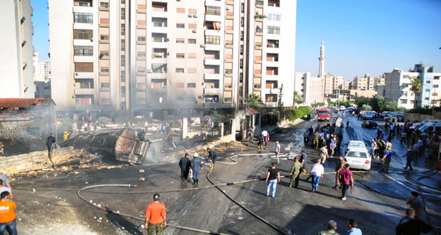 بدوره أوضح قائد فوج الإطفاء العميد عبد الهادي ضاهر في تصريح لمندوبة سانا أن الصهريج اصطدم بسور أحد الأبراج السكنية في الحي وأن سرعة الرياح تسببت بامتداد الحريق إلى الطابق الأول في البرج السكني ما أسفر عن أضرار مادية كبيرة في ثماني شقق سكنية إضافة إلى إلحاق أضرار بخزان كهرباء بالقرب من موقع الحادث.
