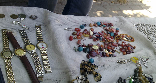 يفترش أبو فراس بضاعته على رصيف إحدى حارات مدينة حمص القديمة ضمن سوق شعبي حيث تمتلىء بأصناف الحلي و المجوهرات من عقود و خواتم وأقراط ومسابح مرصعة و مصنوعة من مختلف أنواع الأحجار الكريمة منها ما هو أصلي وما هو تقليد.