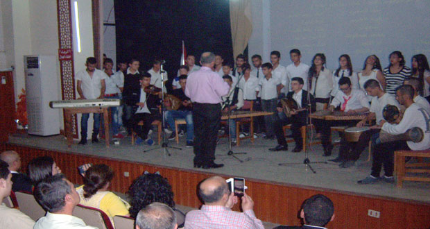 وتضمن الحفل موشحا غنائيا بعنوان “أنشدي يا صبا” ووصلة من أغاني فريد الأطرش لفرقة الكورال ومعزوفة موسيقية بعنوان “القلب يعشق كل جميل” لفرقة الموسيقا ومعزوفة للشاب أوج أبو زيد على آلة القانون لأغنية يا مسافر وحدك لمحمد عبد الوهاب ومعزوفة للشابين عمر أبو هرموش وكنان رسلان بعنوان وحدث في العامرية ورقصة العرس لنصير شما.