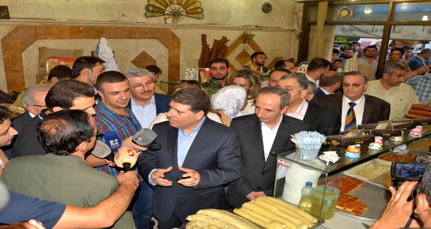 واطلع رئيس مجلس الوزراء الدكتور وائل الحلقى خلال جولة له اليوم فى اسواق حلب وخاصة الشعبية منها على حركة البيع والشراء ومدى توفر السلع والمواد الغذائية والتموينية ومستلزمات عيد الفطر السعيد واستمع الى عدد من المواطنين والتجار واصحاب المحلات التجارية عن احوال السوق والهموم المعيشية التى يعانون منها.