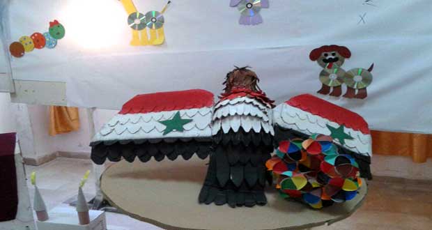 وبين أن الأطفال في ورشته صنعوا النسر العربي السوري والخوذة العسكرية التي ترمز الى الجندي العربي السوري الباسل الذي يدافع عن الوطن وعن طفولتهم ليعيشوا بأمان كما صنعوا دجاجة وبطريقا وكانت المادة الاساسية المصنوعة منها هي نبات اليقطين الذي تم تنظيفه وتلوينه بألوان مختلفة وإضافة بعض قطع الفلين والكرتون وتلوينه بألوان مختلفة حتى يأخذ الشكل المطلوب المراد تكوينه.
