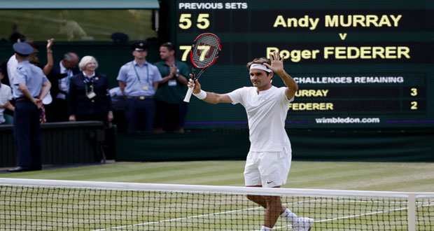فاز السويسري روجر فيدرر على البريطاني اندي موراي بنتيجة 7-5 و 7-5 و 6-4 في الدور قبل النهائي لبطولة ويمبلدون للتنس أمس ليحافظ على مساعيه نحو نيل لقبه الثامن.