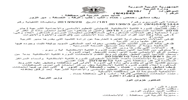 أعلنت وزارة التربية عن دورة ثانية استثنائية لشهادتي التعليم الأساسي والإعدادية الشرعية لعام 2015 تبدأ في 16 من آب القادم في محافظات ريف دمشق وحمص وحماة وإدلب وحلب والرقة والحسكة ودير الزور.