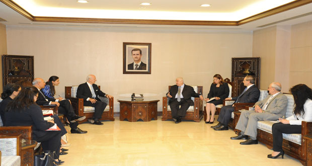 استقبل نائب رئيس مجلس الوزراء وزير الخارجية والمغتربين وليد المعلم اليوم ستافان دي ميستورا المبعوث الخاص للأمين العام للأمم المتحدة إلى سورية والوفد المرافق له حيث قدم دي ميستورا عرضا عن آخر تطورات الوضع فيما يتعلق بمتابعة المشاورات واللقاءات التي أجراها في عدة دول حول إيجاد حل سياسي للأزمة في سورية وذلك قبل الإحاطة التي سيقدمها إلى مجلس الأمن أواخر الشهر الجاري.