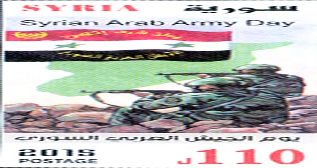 أصدرت المؤسسة العامة للبريد بمناسبة يوم الجيش العربي السوري طابعا بريديا تذكاريا بقيمة مئة وعشر ليرات سيتم وضعه بالتداول في الأول من شهر آب القادم حيث سيكون متوفرا للجمهور والهواة في كل مكاتب المؤسسة المنتشرة في سورية.