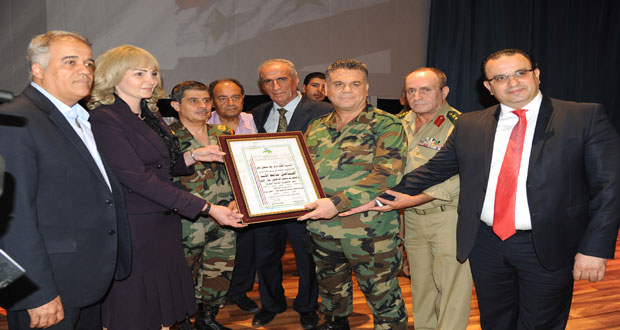 وأضاف.. أن من قرر الاستشهاد قرر الانتصار وحضورنا الى هذا التكريم أحد اشكال انتصار سورية فلا يمكن ان نرقى لقطرة دم واحدة من دماء شهدائنا العظام الذين سقوا ارض الوطن بدمائهم لتفوح نصرا في أرجاء الوطن.