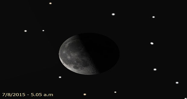 وذكر نائب رئيس الجمعية الفلكية السورية المهندس عبد العزيز سنوبر أنه في تمام الساعة الخامسة وخمس دقائق فجراً بتوقيت دمشق من يوم غد يصل القمر إلى مرحلة التربيع الاخير والتي يقصد بها الفترة التي نرى فيها نصف قرص القمر المواجه لنا مضاء وتتكرر هذه الحالة مرتين.
