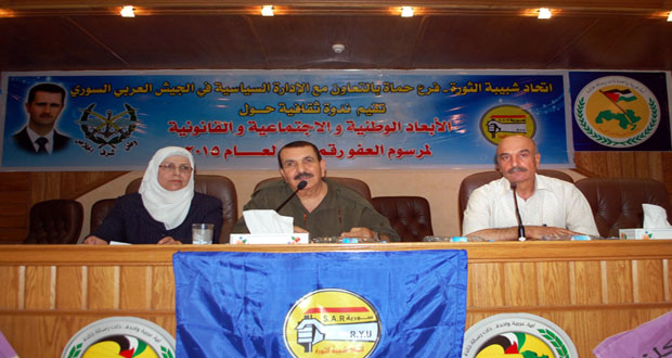 وفي محاضرته أكد عضو قيادة فرع حماة للحزب رئيس مكتب الإعداد والثقافة والإعلام حسين ديوب ضرورة الاستفادة من مرسوم العفو عن جرائم الفرار والالتحاق بصفوف الجيش والقوات المسلحة للدفاع عن الوطن ودور المرأة في هذا المجال من خلال توعية جيل الشباب وبضرورة المساهمة في حماية سورية وبناء مستقبلها.