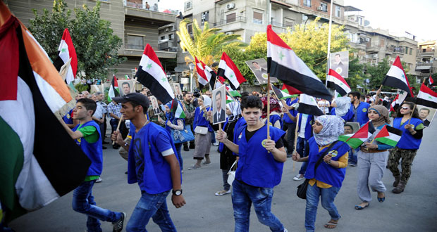 وشدد المشاركون في المسيرة على أن إرادة الشعب لا يمكن أن تقهر وأن النصر قادم بفضل صمود وتضحيات بواسل الجيش وأن الشعب السوري يقف إلى جانب الجيش وخلف قيادته الحكيمة في المعركة ضد الإرهاب.