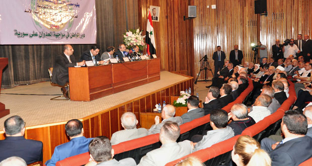وردا على مداخلات الحضور بين المقداد أن “هناك تحولا ملحوظا في الأوضاع الداخلية والاقليمية والدولية بسبب ما حققه صمود الشعب وتضحيات الجيش السوري خلال خمس سنوات من الحرب الشرسة عليه” لافتا إلى أن هذا الصمود اقنع الدول المتامرة على سورية بأنها لن تصل إلى نتيجة.