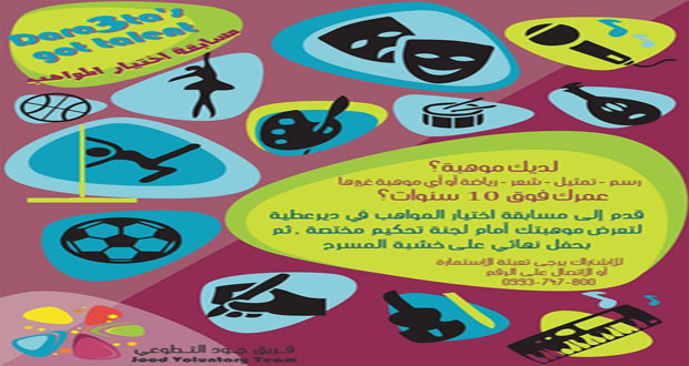 ضمن برنامجه الهادف لنشر المعرفة والثقافة كشكل من أشكال التنمية الفكرية المستدامة أقام فريق جود التطوعي في دير عطية بريف دمشق مسابقة اختيار المواهب لتطوير الحس الإبداعي وتحفيز الملكات الفنية المختلفة لدى جمهور الشباب من أعضاء الفريق ممن يمكنهم تقديم مشاركاتهم وفق مجموعة من الشروط والمعايير التي وضعتها لجنة تحكيم متخصصة.