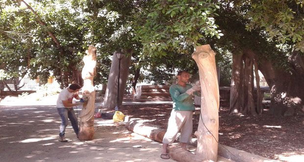 تحت ظلال أشجار حديقة المتحف الوطني في اللاذقية توزع عشرة نحاتين سوريين من مختلف المحافظات شبابا ومخضرمين حملوا أفكارهم ومجسماتهم الخشبية الصغيرة قاصدين ملتقى “أغافي” للنحت على الخشب ليحولوها إلى مجسمات كبيرة باستخدام أدواتهم الخاصة التي تتعامل مع جذوع شجر الصنوبر لتطويع سطوحها وتحويلها إلى منحوتات فنية متميزة.
