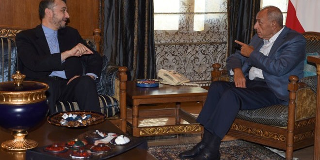بحث رئيس مجلس النواب اللبناني نبيه بري اليوم مع مساعد وزير الخارجية الإيراني حسين أمير عبد اللهيان والوفد المرافق له آخر التطورات في لبنان والمنطقة.