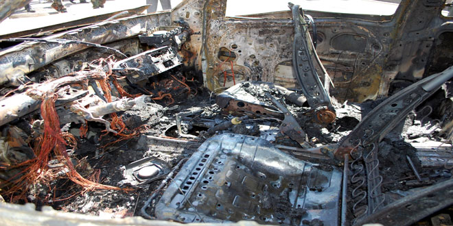 وذكر مصدر في قيادة الشرطة لمراسل سانا أن إرهابيين فجروا عبوة ناسفة ألصقوها بسيارة من نوع بيك آب قرب مطعم عصفور في حي الحاضر شمال شرق مدينة حماة ما أسفر عن احتراقها مع سيارة أخرى كانت مركونة في المكان.