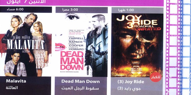أما الفيلم الثالث فيعرض عند السادسة مساء بعنوان “العائلة” وهو فيلم اكشن كوميدي جريمة من انتاج 2013 بطولة روبرت دي نيرو وميشيل فايفر وديانا أغرون.. ويحكي قصة افراد من المافيا يذهبون الى نورماندي في فرنسا في اطار برنامج حماية الشهود حيث تكشف المافيا مكان اختبائهم بسبب تصرفاتهم ويتعرضون للكثير من المشاكل.