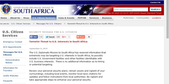 أصدرت السفارة الاميركية في جنوب افريقيا اليوم تحذيرا من “تهديد إرهابي” للمصالح الأميركية ناصحة الرعايا الامريكيين في هذا البلد بـ “توخي الحذر الشديد”.