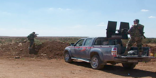 وكانت وحدات من الجيش مدعومة بسلاح الجو قضت أمس على عدد من الإرهابيين التكفيريين ودمرت عربة مصفحة وسيارتى بيك أب مزودتين برشاشين بمن فيهما في مدخل وادي الذكاري وشرق مثلث تدمر وشمال شرق المقالع وبين مدخلي واديي الذكاري والماسك ومدينتي تدمر والقريتين.