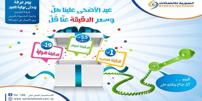 أعلنت الشركة السورية للاتصالات إجراءها حملة تخفيضات كبيرة على أجور الاتصالات الدولية والقطرية والخلوية الصادرة من الهاتف الثابت بمناسبة عيد الأضحى المبارك تحت عنوان “عيد الأضحى علينا هل…وسعر الدقيقة عنا قل”.