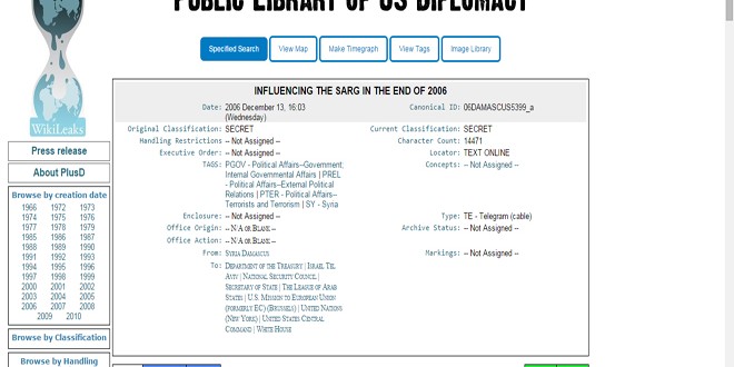 كشفت صحيفة الأخبار اللبنانية عن وثيقة سرية أمريكية سربها موقع ويكيليكس تؤكد أن الولايات المتحدة الأمريكية خططت في كانون الاول عام 2006 “لزعزعة الاستقرار في سورية والعمل على تقويض حكم الرئيس بشار الأسد”.