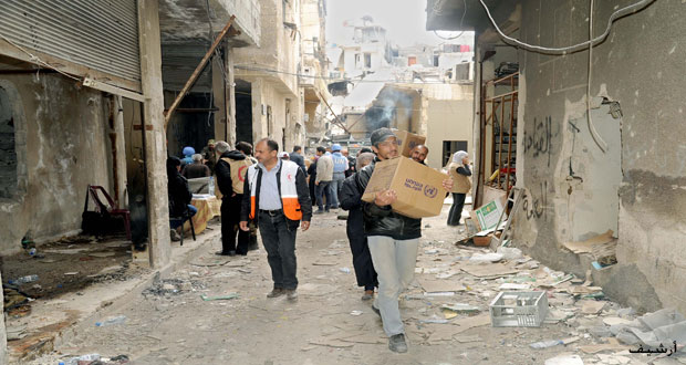 بدعم من الحكومة السورية وبإشراف اللجنة العليا للإغاثة تستمر الهيئة العامة للاجئين الفلسطينيين العرب ووكالة غوث وتشغيل اللاجئين الفلسطينيين الأونروا بتوزيع المساعدات الإنسانية على أهالي مخيم اليرموك المحاصرين من قبل المجموعات الإرهابية المسلحة وذلك في شارع راما في المخيم بدمشق.