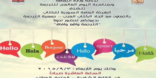 تقيم الهيئة العامة السورية للكتاب بالتعاون مع اتحاد الكتاب العرب جمعية الترجمة ندوة بعنوان “الترجمة واقع وافاق” وذلك في الساعة العاشرة من صباح يوم الأربعاء القادم في القاعة الشامية بالمتحف الوطني بدمشق.