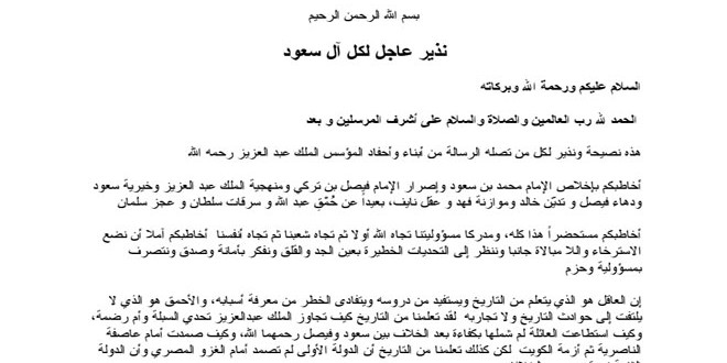 ويدعو الأمير في رسالتيه الأولاد الـ13 الباقين لـ ابن سعود وخصوصا الأمراء طلال وتركي وأحمد بن عبد العزيز إلى التوحد والإطاحة بالزعامة في القصر السعودي قبل تشكيل حكومة جديدة.