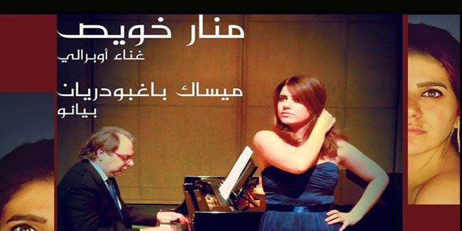 تقدم دار الأسد للثقافة والفنون أمسية غناء أوبرالي يحيها كل من مغنية السوبرانو منار خويص وعازف البيانو ميساك باغبودريان وذلك عند الساعة السادسة من مساء غد الخميس في الصالة متعددة الاستعمالات.