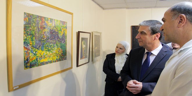 وقال رئيس اتحاد الفنانين التشكيليين المشارك في المعرض بعمل ميدالية معدنية بقطر 130 سم باسلوب واقعي تعببري وتحمل روليف جانبي لفتاة دمشقية مع الدرابزون الدمشقي القديم وعبق الياسمين وعن المعرض.. إن المشاركين في المعرض هم من اهم الفنانين السوريين الذين مازالوا يعملون ويطورون تجاربهم ليقدموا صورة عن حياة الانسان السوري ولم يتوقفوا عن العمل مؤكدا أن التشكيليين السوريين سيستمرون بالقيام بدورهم الثقافي والفني في بناء وتطوير واصلاح المجتمع رغم كل الصعوبات التي تواجه عملهم وحياتهم كما كل السوريين.