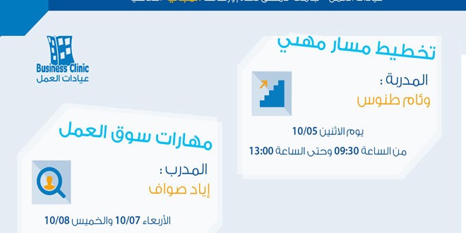 تتواصل ورشات العمل المجانية التى يقيمها مركز عيادات العمل التابع لجامعة دمشق حول تخطيط المسار المهني وكيفية اختيار الوظيفة المناسبة للباحث عن حيز فى سوق العمل حيث يشارك في الورشات التى تقام تحت اشراف الامانة السورية للتنمية عدد كبير من المتطوعين العاملين فى الجمعيات الاهلية المختلفة ممن يسعون الى اكتساب الخبرات اللازمة للنهوض بتجاربهم المهنية الخاصة اثر تلقى مجموعة من المحاضرات النوعية ذات الصلة بآليات دعم الاقتصاد الوطنى خلال الازمة الراهنة.