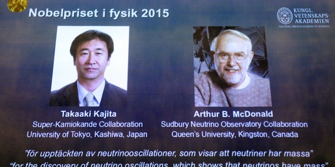 حاز الياباني تاكاكي كاجيتا والكندي ارثر ب. ماكدونال اليوم جائزة نوبل للفيزياء للعام 2015 ل أعمالهما حول النيوترينو وهي جزئيات أولية اثبتا أنها تتمتع بكتلة.