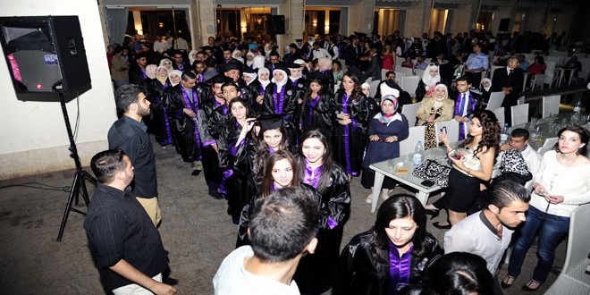 احتفلت جامعة دمشق اليوم بتخريج 450 طالبا وطالبة من كلية الطب البشري في مدينة الشباب بالمزة.