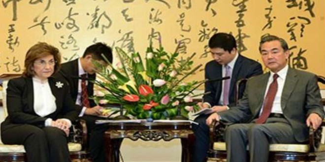 تلبية لدعوة من وزارة الخارجية الصينية اجتمعت الدكتورة بثينة شعبان المستشارة السياسية والإعلامية في رئاسة الجمهورية مع وانغ إي وزير الخارجية الصيني بمقر الوزارة في بكين.