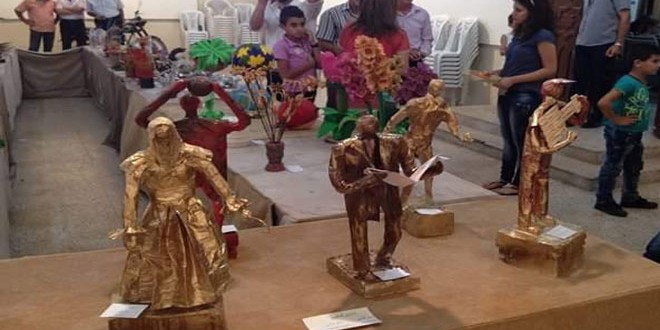 وتنوعت أعمال الأطفال بين 50 لوحة مرسومة بألوان الباستيل و100لوحة بالألون المائية تناولت حب الوطن وتضحيات الجيش العربي السوري ضد الإرهاب و30لوحة نافرة و 20لوحة خط عربي فضلا عن أعمال يدوية وتشكيل مجسمات من الجبس والحفر على الخشب ومن توالف البيئة والورق والصلصال وأخرى منوعة ما بين أدوات منزلية مكسرة وقطع من الورق والبلاستيك.