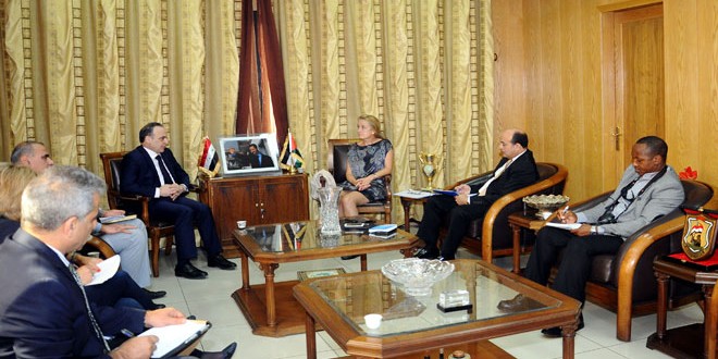 بحث وزير الكهرباء المهندس عماد خميس مع الممثل المقيم لمنظمة الصحة العالمية بدمشق اليزابيت هوف سبل التعاون المشترك في مجال تلبية احتياجات المراكز الصحية التابعة للوزارة من الادوية اللازمة وامكانية تدريب العاملين الميدانيين فيها على مهارات الإسعاف الاولي الاساسية.