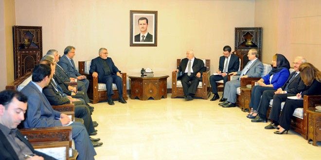 استقبل وليد المعلم نائب رئيس مجلس الوزراء وزير الخارجية والمغتربين صباح اليوم الدكتور علاء الدين بروجردي رئيس لجنة الأمن القومي والسياسة الخارجية في مجلس الشورى الإيراني والوفد المرافق.