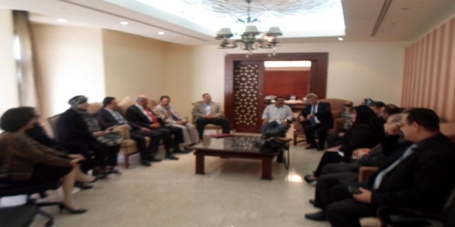 وقال التحالف الذي يضم ممثلين عن مختلف شرائح المجتمع المصري في خطاب تضامني مع سورية تسلمه الدكتور رياض سنيح رئيس البعثة القنصلية السورية بالقاهرة اليوم “من مصر قلب الأمة العربية وحصنها الحصين وباسم جموع الشعب المصري الحر الأصيل نتقدم باسمى آيات الشكر والفخر والإعزاز إلى الشعب العربي الحر الآبي في الجمهورية العربية السورية وإلى أبطال الجيش العربي السوري وإلى السيد الرئيس بشار الأسد رئيس الجمهورية العربية السورية لما يقدموه من تضحيات وبطولات نيابة عن شعوب العالم بصفة عامة وشعوب المنطقة بصفة خاصة ضد الإرهاب الغاشم والإرهابيين المموليين من قوى البغي والتخريب للنيل من وحدة وسلامة أمتنا العربية”.
