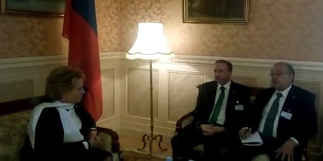 بحث رئيس مجلس الشعب محمد جهاد اللحام مع رئيسة مجلس الاتحاد الروسي فالنتينا ماتفينكو اليوم سبل تفعيل دور الدبلوماسية البرلمانية في الجهود الدولية لمحاربة الإرهاب وتعزيز الأمن والسلم الدوليين باعتبارهما الحامل للتنمية والديمقراطية وحقوق الإنسان.